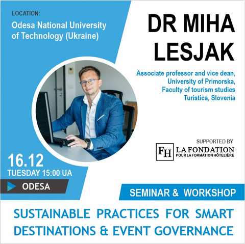 Шановні колеги! Запрошуємо вас взяти участь у міжнародному онлайн-вебінарі “Sustainable Practices for Smart Destinations & Event Governance”, який проводиться за підтримки La Fondation pour la Formation Hôtelière (Швейцарія). Цей захід є безкоштовними та орієнтованим на викладачів, студентів і фахівців сфери гостинності. Учасники отримають короткий огляд сталих практик у розвитку дестинацій, принципів організації smart events та реальний кейс Green Planica — інновації у спортивних заходах.