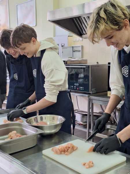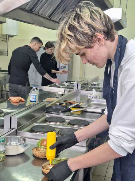 Разом з викладачем кафедри готельно-ресторанного бізнесу Антонюк Юлією Анатоліївною та студентами спеціальності J2 «Готельно-ресторанна справа та кейтеринг» Мазуліним Сергієм і Петровою Христиною хлопці та дівчата: готували котлети, нарізали овочі, збирали свої авторські бургери та вчилися працювати в команді на професійній кухні.
