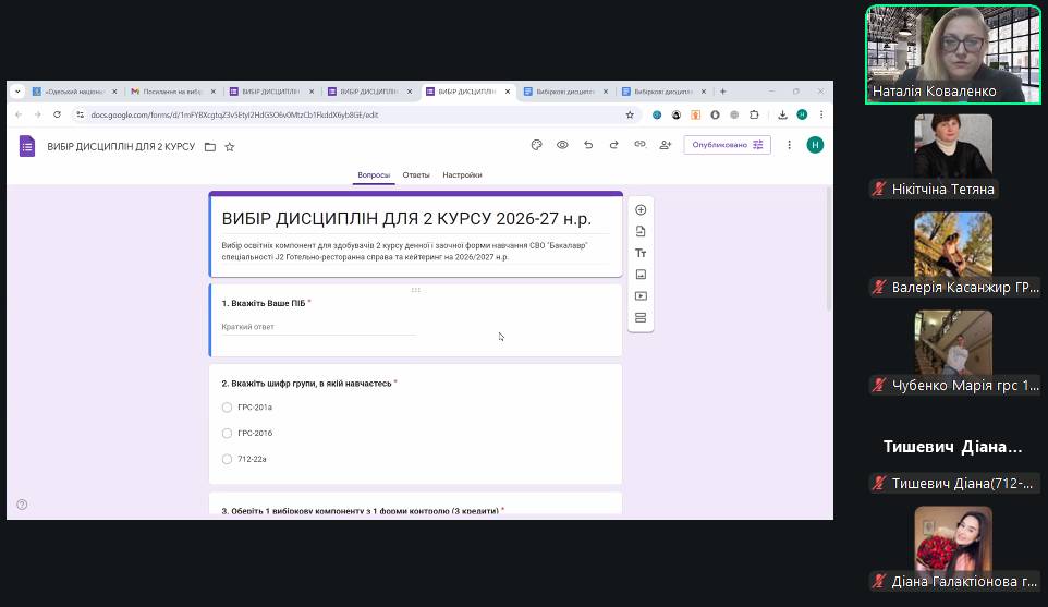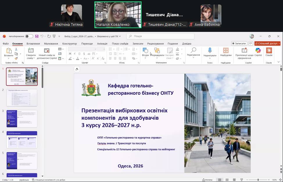 Для здобувачів спеціальності J2 «Готельно-ресторанна справа та кейтеринг» викладачами кафедри готельно-ресторанного бізнесу Одеського національного технологічного університету було організовано захід щодо вибору вибіркових освітніх компонентів на наступний навчальний рік 2026/27.