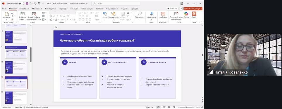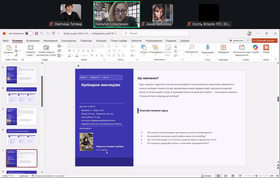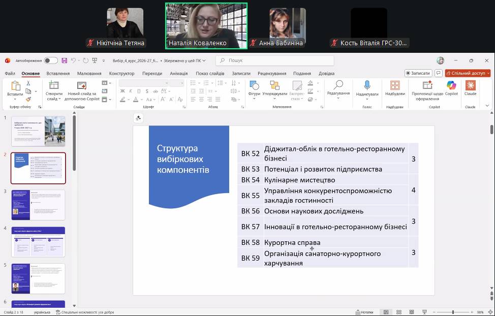 У заході взяли участь здобувачі 1, 2 та 3 курсів денної та заочної форми навчання СВО «Бакалавр» J2 «Готельно-ресторанна справа та кейтеринг». Під час зустрічі здобувачі мали можливість ознайомитися зі змістом вибіркових освітніх компонентів і отримали можливість обрати дисципліни відповідно до власних освітніх потреб. Проведення таких заходів є важливим елементом реалізації студентоцентрованого підходу в освітньому процесі та формування індивідуальної освітньої траєкторії здобувачів.