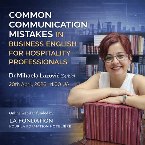 «COMMON COMMUNICATION MISTAKES IN BUSINESS ENGLISH FOR HOSPITALITY PROFESSIONALS», який відбудеться 20 квітня 2026 року онлайн через Zoom.
